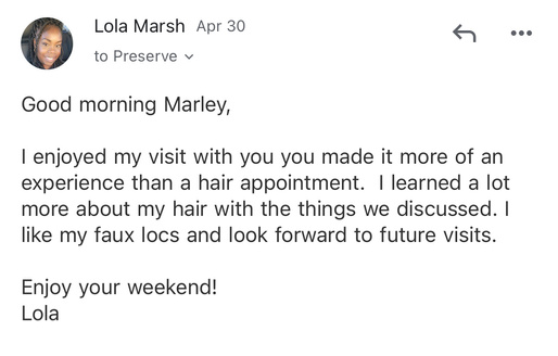 I’ve been catering to my clients since 2019, and have been blessed to have women travel from near and far just to experience what it’s like here at Preserve Hair Studio.